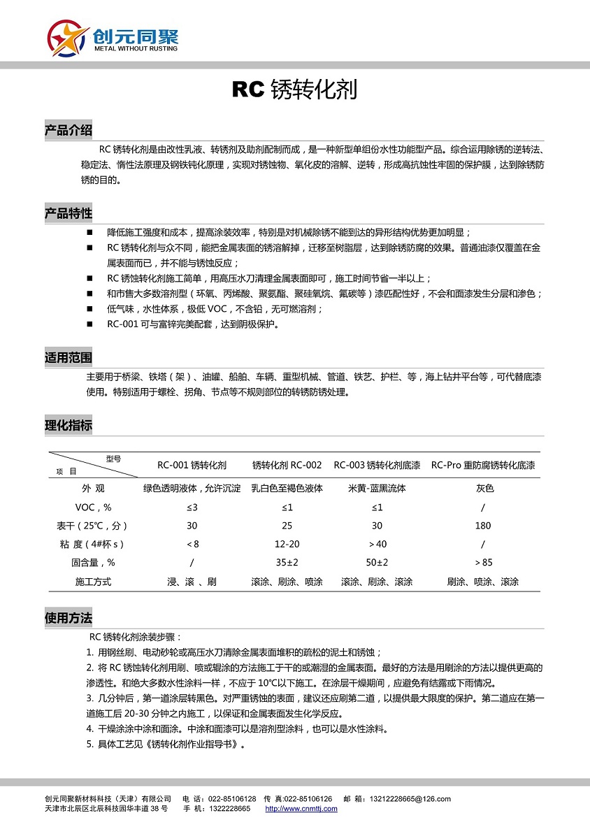 產(chǎn)品型號及名稱 用途/特點(diǎn) RC-001銹轉(zhuǎn)化劑 最大轉(zhuǎn)銹厚度達(dá)200um,可與富鋅底漆配套,用于C4 - C5的沿海腐蝕環(huán)境(比較嚴(yán)重的腐蝕環(huán)境)可以在港口及沿海、海上平臺等環(huán)境下應(yīng)用。 RC-002銹轉(zhuǎn)化劑 最大轉(zhuǎn)銹厚度達(dá)80um,可代替一道底漆,用于建筑物和橋梁鋼結(jié)構(gòu)所處的防腐環(huán)境從鄉(xiāng)村地區(qū)、污染較輕的城市(腐蝕性等級C2)城市和工業(yè)中等二氧化硫污染;低鹽度的沿海地區(qū)、高濕度并且有一些空氣污染的生產(chǎn)車間(腐蝕等級C3),環(huán)境下的應(yīng)用。 RC-003銹轉(zhuǎn)化底漆 最大轉(zhuǎn)銹厚度達(dá)40um,可代替底漆,用于建筑物和橋梁鋼結(jié)構(gòu)所處的防腐環(huán)境從鄉(xiāng)村地區(qū)、污染較輕的城市(腐蝕性等級C2)到工業(yè)區(qū)和中等鹽度的沿海地區(qū)。如:化工廠、海邊商店、造船廠等。 RC-Pro銹轉(zhuǎn)化重防腐底漆 最大轉(zhuǎn)銹厚度40微米,可用于ISO12944中C4 - C5的高污染高濕度的工業(yè)區(qū),高鹽度的海洋、近海區(qū),比較嚴(yán)重的沿海腐蝕環(huán)境。